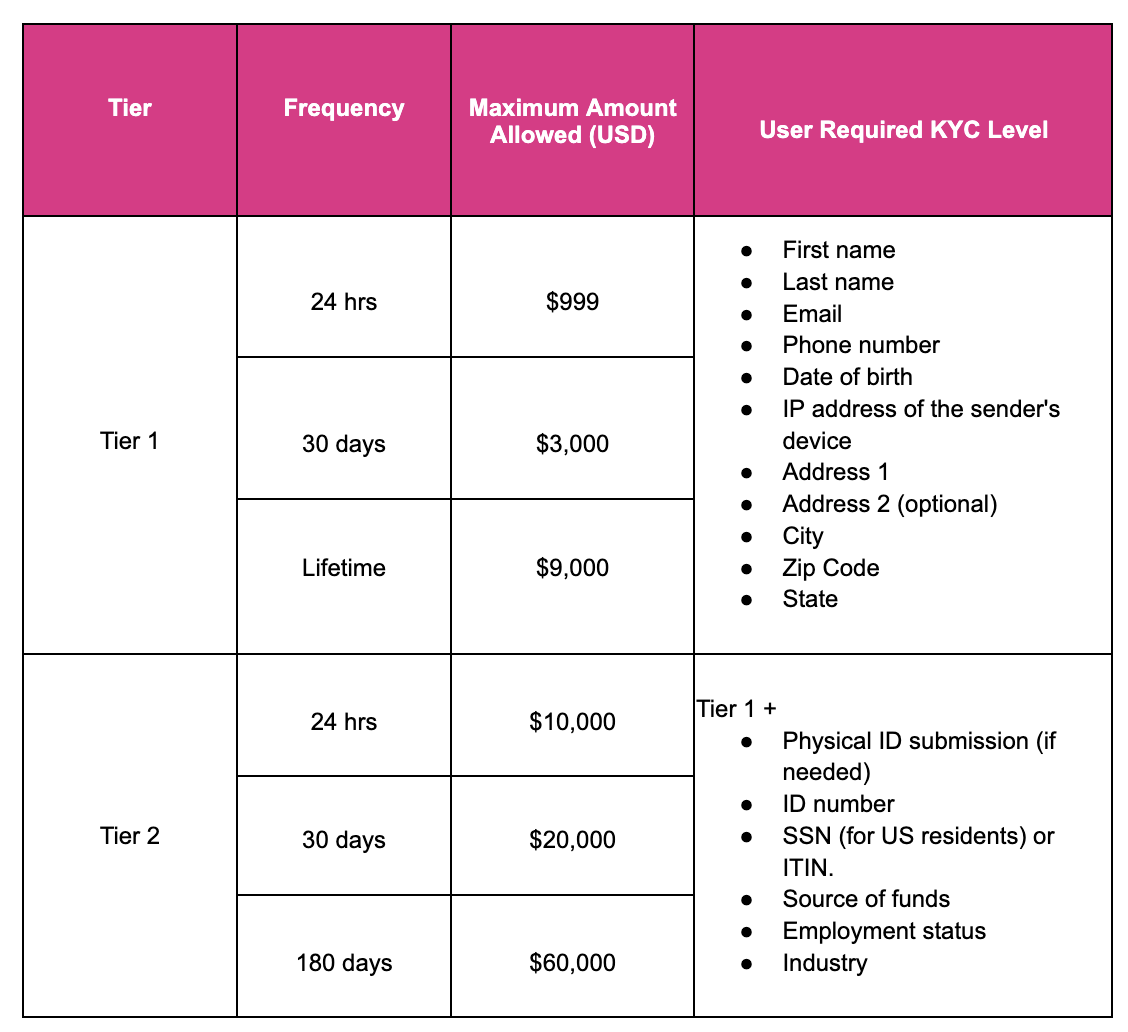 The level of KYC completed determines the user transaction limits, including both allowed amounts and frequency.