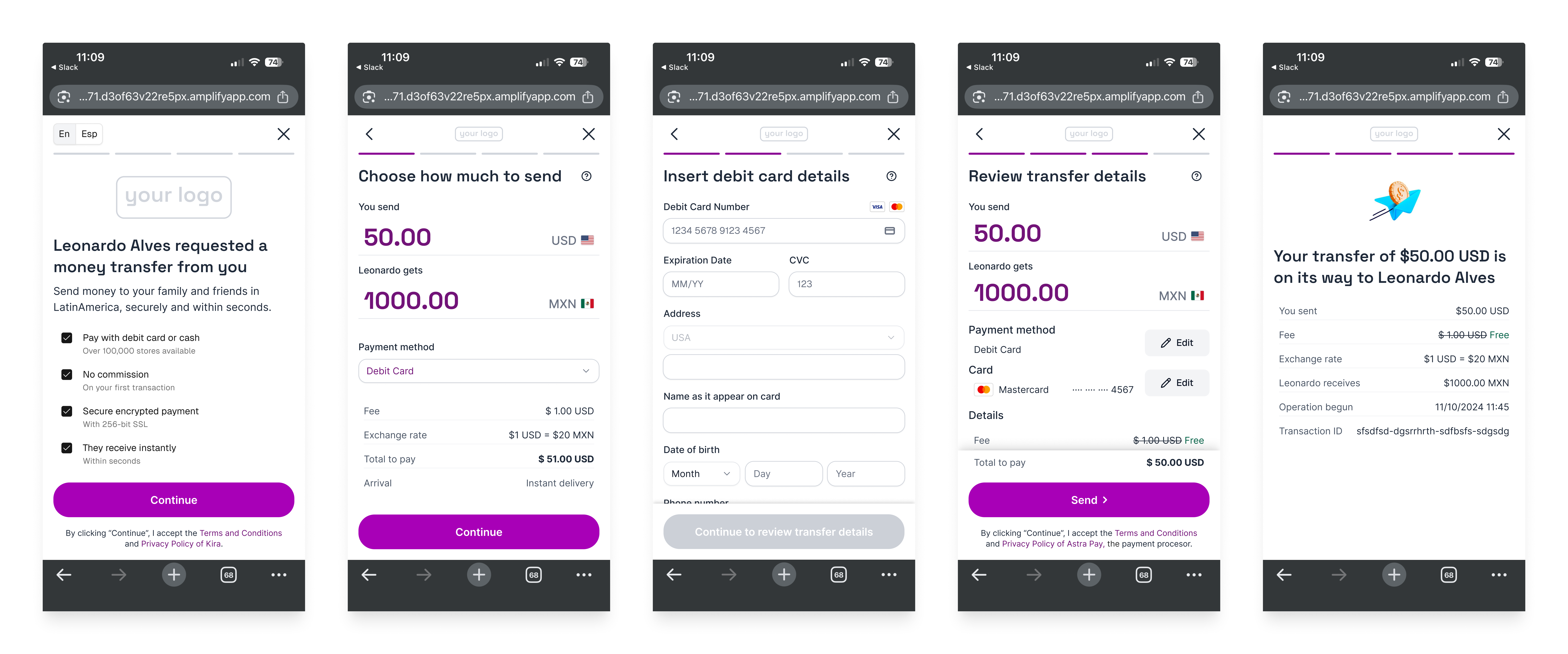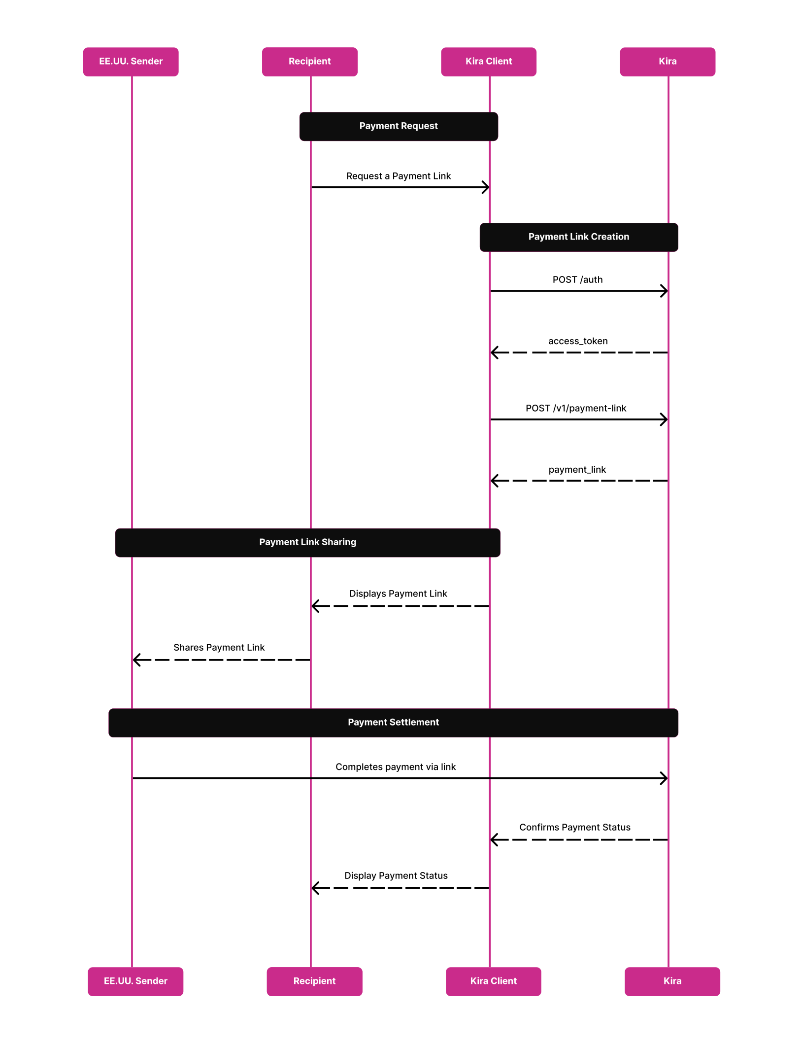 This functionality requires no more than 2 API calls on your side, which generates a payment link customized with your brand, while Kira manages all sender-related processes, including KYC verification, payment details, and payment processes.