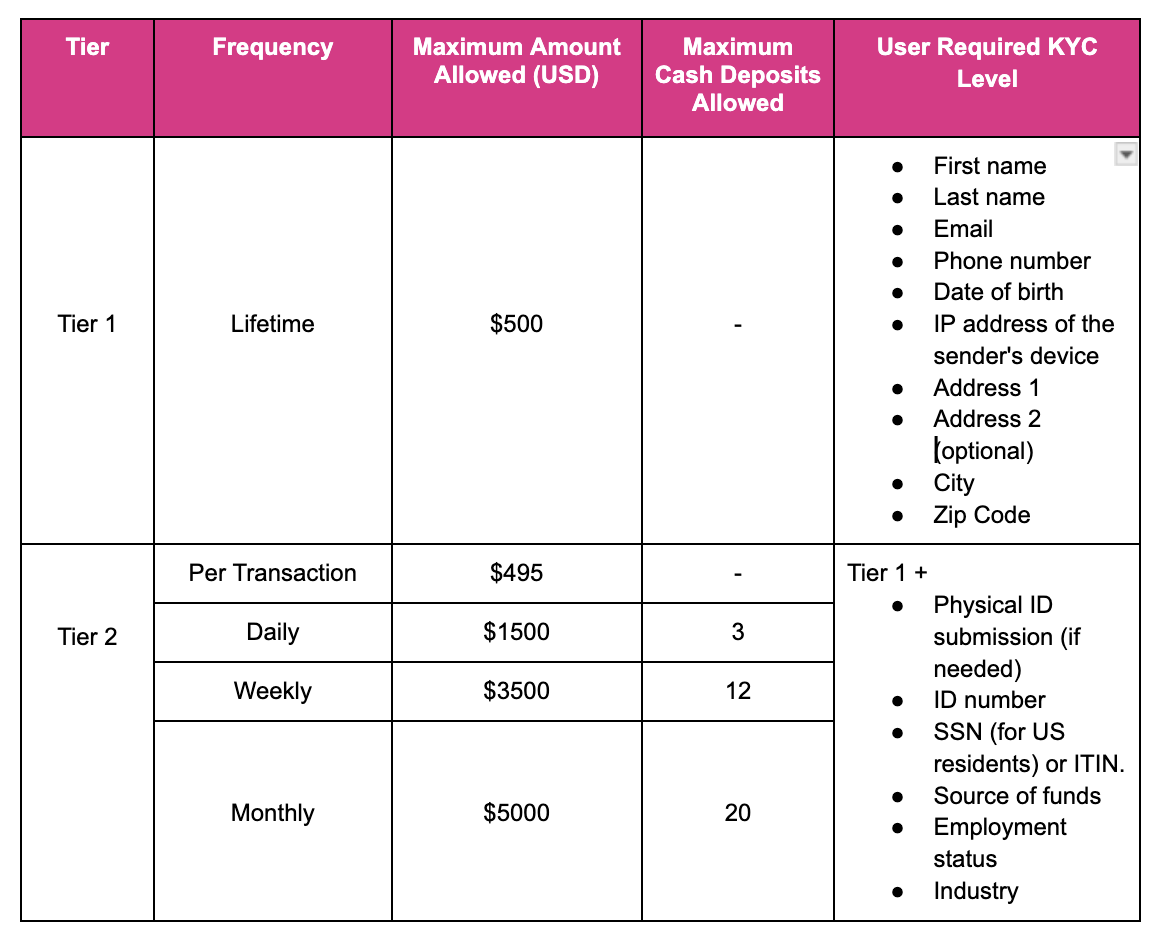 - Tier 2 - Full KYC: Requires additional details such as ID number, source of funds, employment status, industry, SSN (for U.S. residents) or ITIN, and sometimes physical ID submission. It is requested when a user’s cash or card transactions exceed the limits allowed under the Simplified KYC tier. Once completed, it does not need to be repeated and increases the sender’s transaction limits.